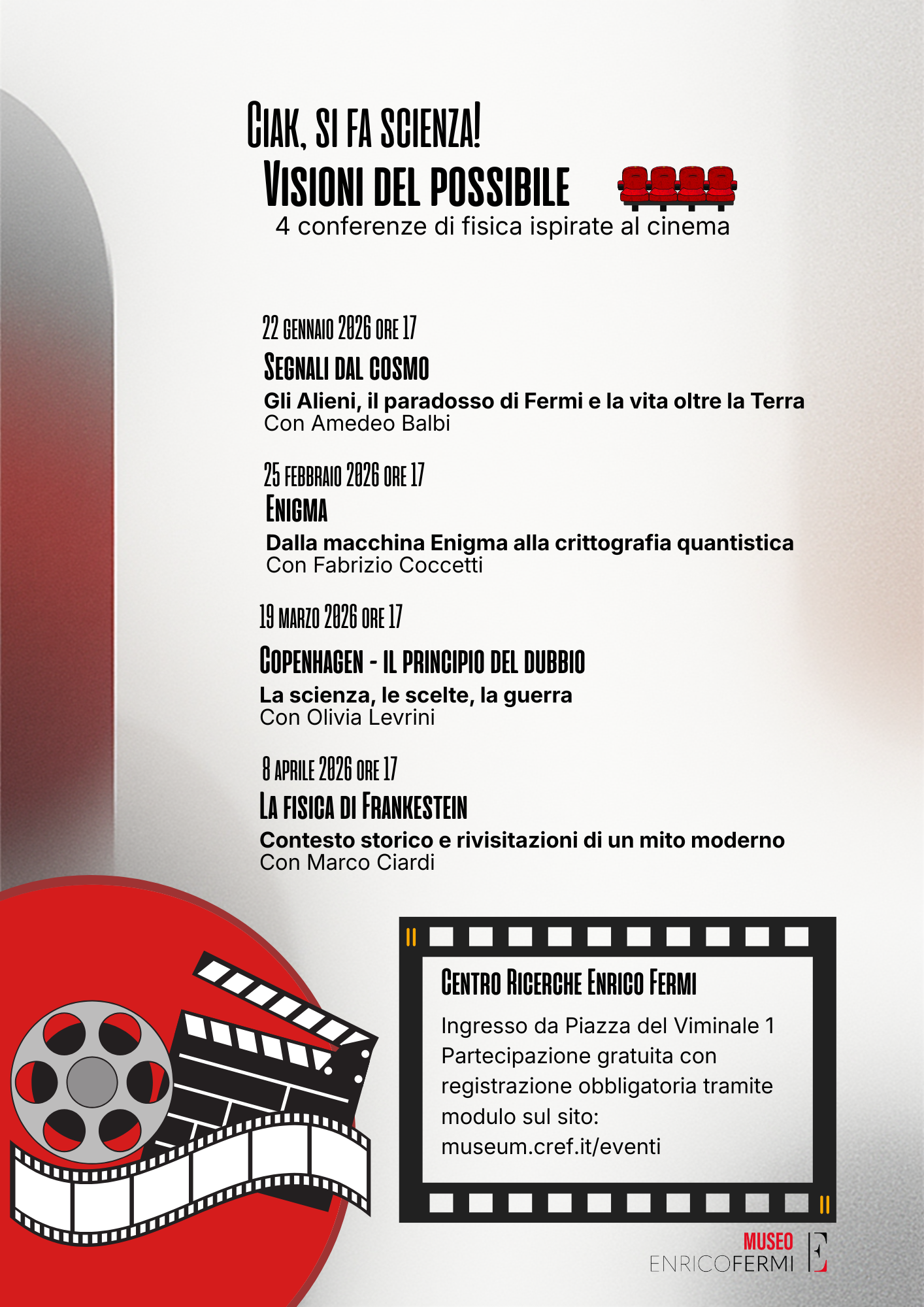 “Ciak, si fa Scienza” è più di un ciclo di seminari: è un’occasione per riscoprire il Museo “Enrico Fermi” e la nostra sede storica come luoghi di dialogo aperto. Che siate studenti, appassionati di cinema o menti curiose, vi invitiamo a scoprire come le storie che vediamo sul grande schermo influenzino il nostro modo di intendere il futuro.